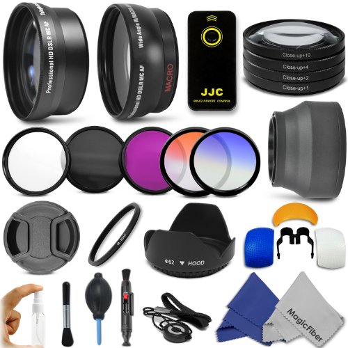 Buy 52MM Essentials Kit for NIKON DSLR (D5100 D5000 D3200 D3000 D90 D80) - Includes: 0.43x Wide Angle & 2.2x Telephoto High Definition Lenses IR Wireless Remote Control Filter Kit (UV, CPL, FLD) Macro Close-Up Set Tulip Lens Hood Center Pinch Lens Cap 2 Color Filters Lens Cleaning Pen Flash Diffuser Set Deluxe Cleaning Kit MagicFiber Microfibers Today!